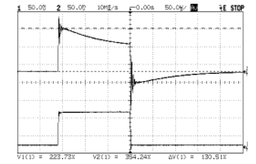 The lower trace represents the applied current pulse. The droop rate is the first term (linear) of the power series representing that exponential decay. The time constant of the decay is the reciprocal of the droop rate, or the time interval for 100 % decay predicted by the linear term. The droop rate (D) is also mathematically connected to the low frequency cut-off point (f):